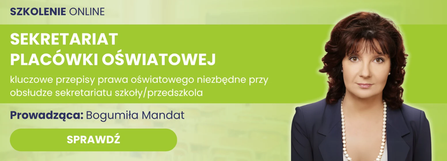 Kliknij grafikę poniżej i poznaj program szkolenia: Sekretariat placówki oświatowej 2025 - poznaj kluczowe przepisy prawa oświatowego niezbędne przy obsłudze sekretariatu szkoły/przedszkola