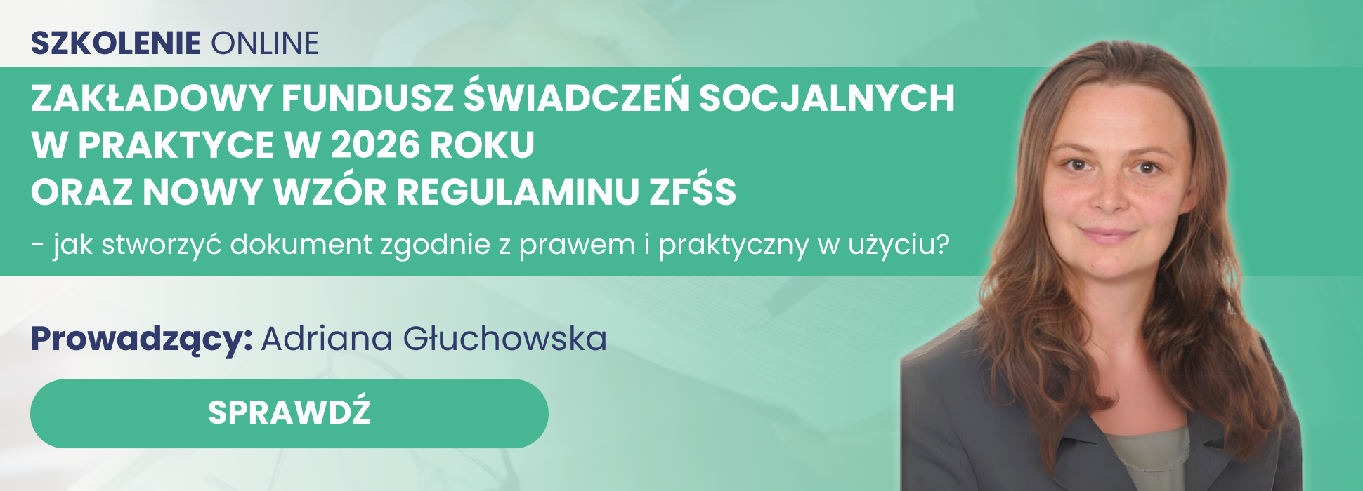 Kliknij w grafikę poniżej i poznaj program szkolenia: Zakładowy Fundusz Świadczeń Socjalnych w praktyce w 2026 roku oraz nowy wzór regulaminu ZFŚS - jak stworzyć dokument zgodnie z prawem i praktyczny w użyciu?